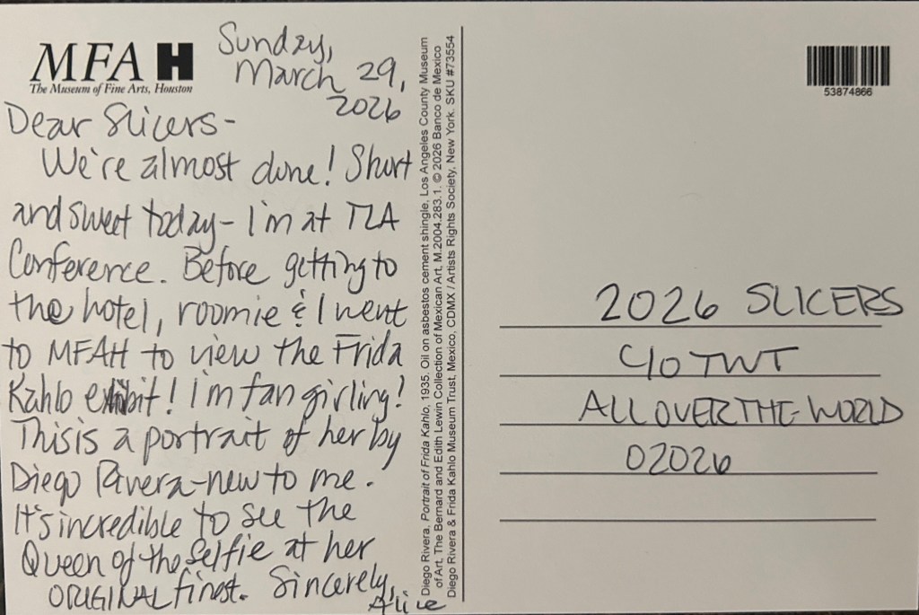 We’re almost done! Short and sweet today-I’m at TLA conference. Before getting to the hotel, roomie and I went to MFAH to view the Frida Kahlo exhibit! I’m fangirling! This is a portrait of her by Diego Rivera-new to me. It’s incredible to see the Queen of the Selfie at her ORIGINAL finest!