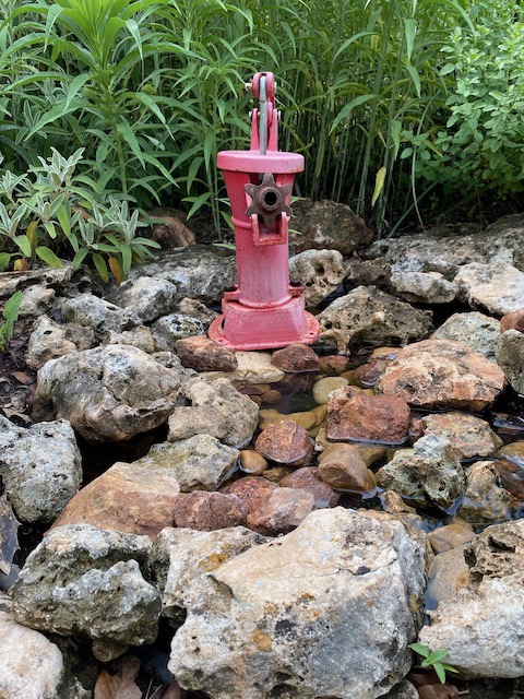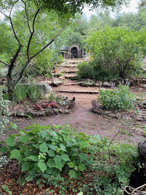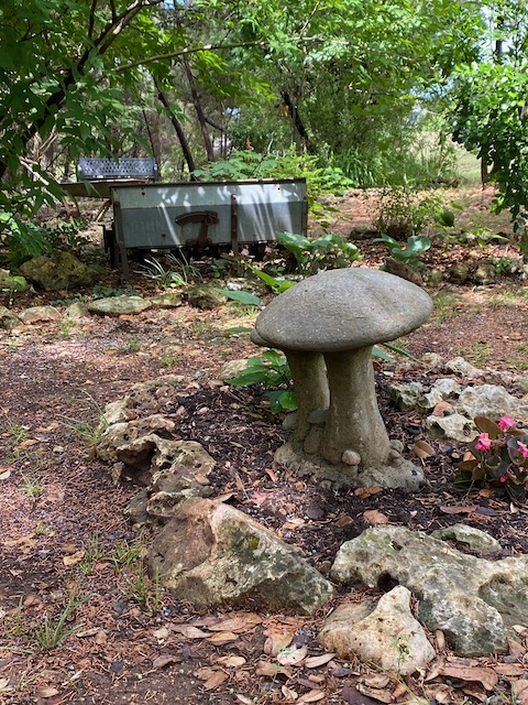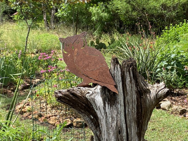 I enter the garden area where small bird baths are nestled around wildflowers and wind chimes gently sing in the breeze. Benches and rustic garden treasures complement the plants. Steps lead back to the sidewalk in two more areas and an iron owl greets me as I pass by. I stop for a few photos to share with the ‘tween who wishes there were more places to explore because living in a subdivision is so boring. I have to prove it’s worthy of exploration.