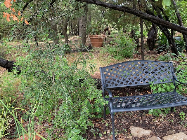 It’s a transition space between the kids’ area tucked into a dense section of trees and the garden, complete with an entry. By this time, my shoes are so thick with mud, I tread carefully so I don’t slip rather than get caught trespassing. Is this space public? I can tell it isn’t part of the house next to it because there’s a clear distinction between the lawn and this space. Is it an HOA project? It looks too natural to be tended by an HOA. An HOA would’ve ripped the trees out and made sure the bench was anything but wood. Don’t want to be liable for anyone getting a splinter.