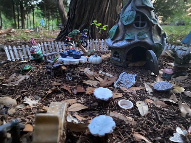 I approach the area, which has three entry points. The first one, where I see the little blue box of a library tucked into trees has a saucer swing waiting for a youngster to climb into. Squish. My shoe sinks into the mud. Do I keep going? Might as well, I already started along a path. Regardless of which direction I go, more mud will stick to my shoes. This section is set up for littles. A split log creates a bench where a colander waits for someone to sift for acorns, leaves, bits of twigs. Two tiny Tonka trucks are positioned on one edge of the path.