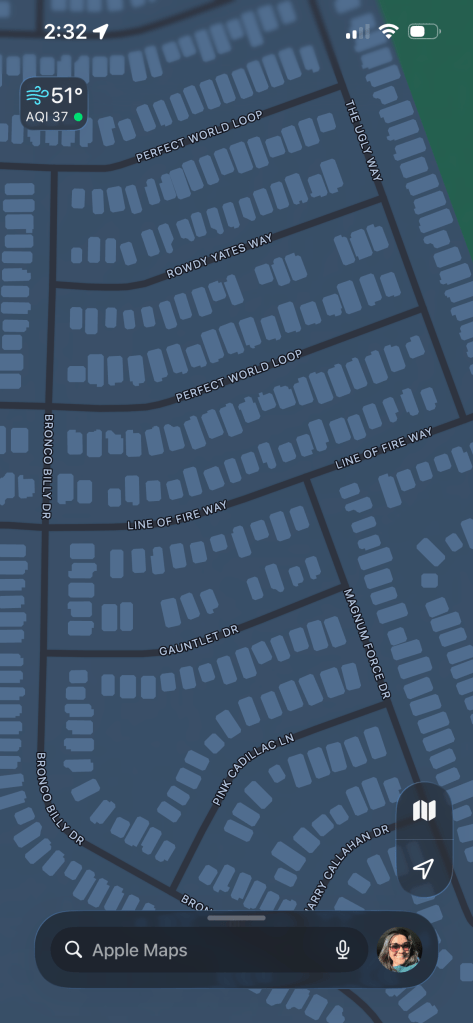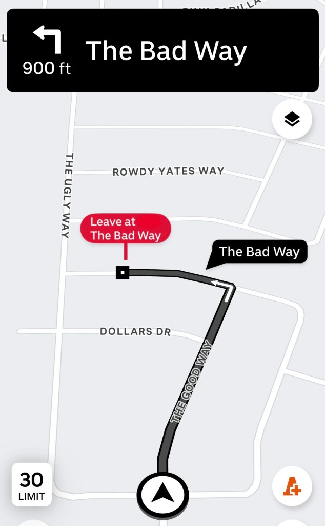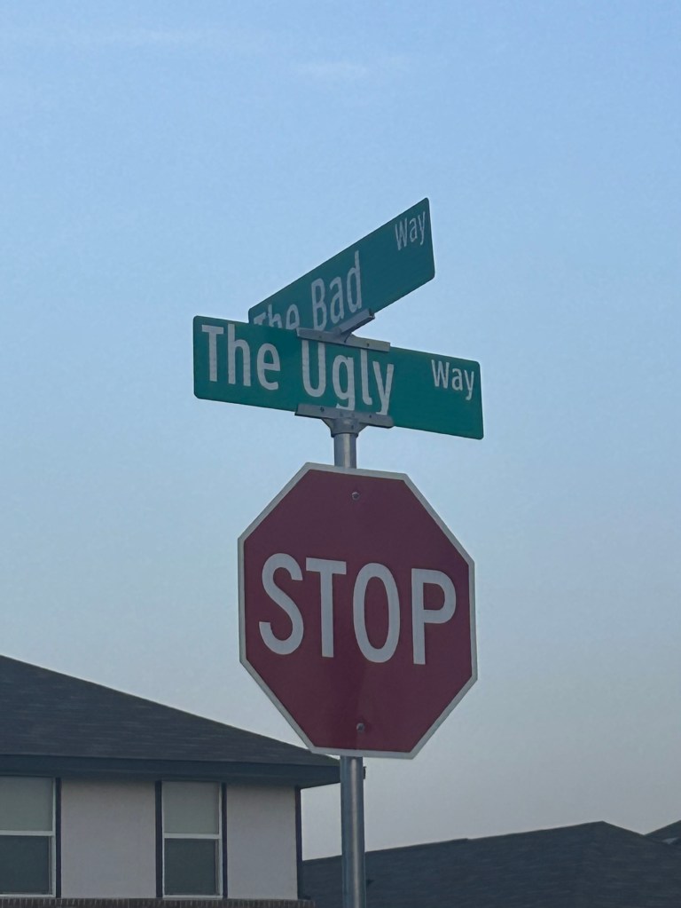He drove through The Good, The Bad, and The Ugly. Gotta love how builders select names for subdivisions and stick to the theme. Stories manage to find their way into every part of our lives. I read about a Friends themed subdivision being built a few years ago in a nearby town. Friends in Texas.