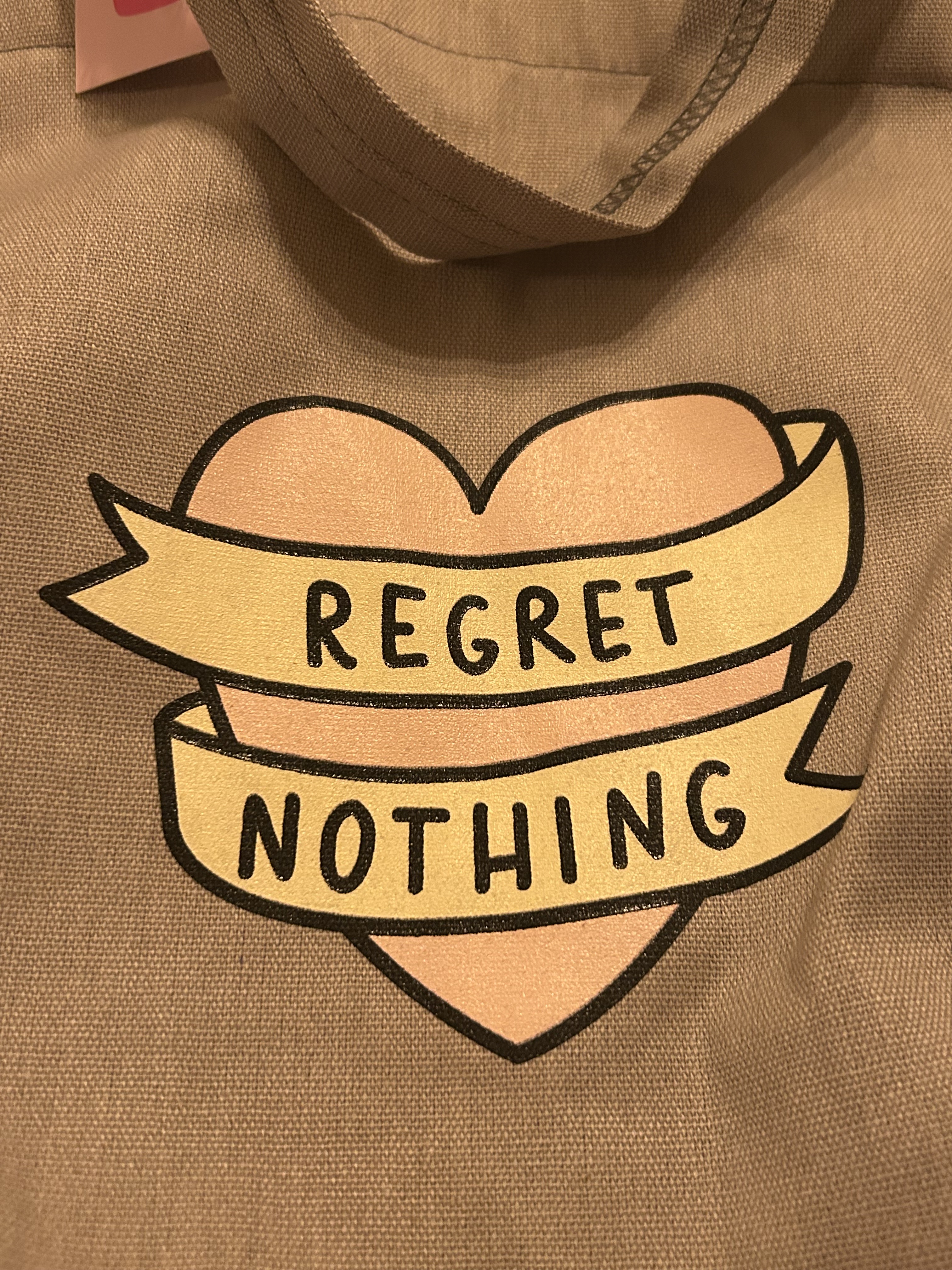 The icing on my slice of cake with un-brewed coffee was finding a surprise gift from a friend waiting at my seat. A great tote bag stuffed with mini-notebooks, a cheerful pencil pouch, and fun pencils reminded me to regret nothing, even if it means being late.