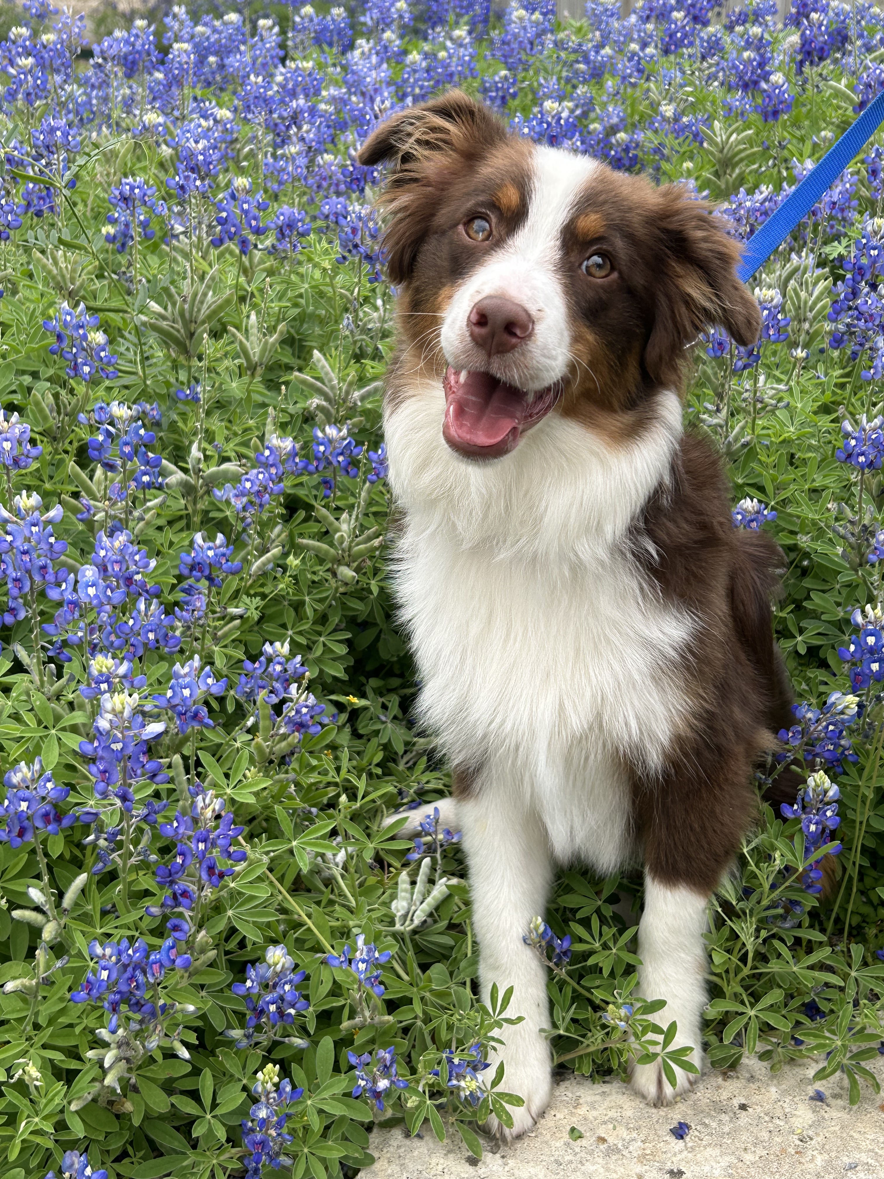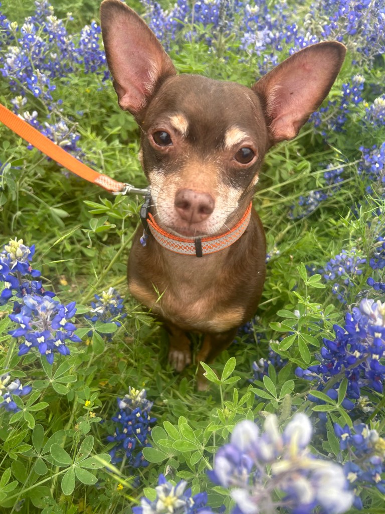 We had lunch and headed out. It’s the sweet spot of the season. They’re popping and in a week or so they’ll go to seed. There will be some places where they’ll last a little longer, but soon they will make way for other flowers to have their turn. There’s no sense in driving out to find the perfect place when there are plenty nearby. We take our Chihuahua mix, Reeses, and Dipper, our newest addition.
